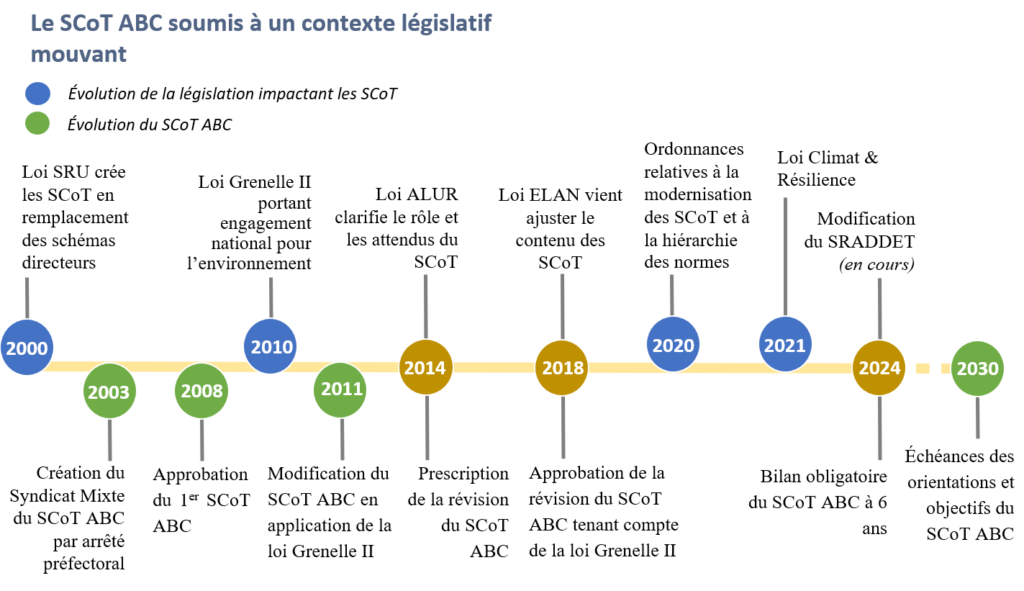 Depuis la création du Syndicat Mixte en 2003, et l’élaboration du SCoT approuvé en 2008, le document a connu plusieurs évolutions en lien avec le contexte législatif :